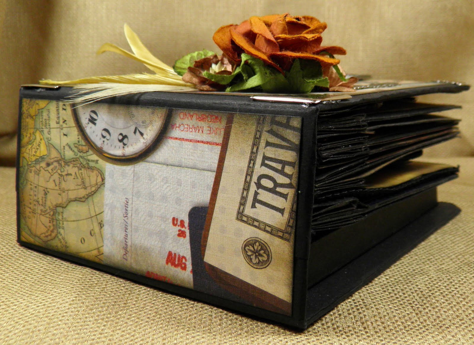 The album measures 5" (h) x 6-1/4" (l) x 2-1/2" (w), and the thick chipboard cover has the strength, stability and feel of a bound book -- no rings or spirals -- and the front cover has protective silver metal corners. There is also a smaller leather bound wallet size (3-3/4" x 5") scrapbook album tucked into a pocket on the back cover of the larger mini album. Both albums were created using top-of-the-line papers and embellishment by Tim Holtz, Graphic 45 and Bo Bunny, etc. So many details, including copper wire, metal charms and embellishments, and photography flim, that add just the right touches to emphasize photos. There are enough pockets and multi-layered photo mats to hold over 50 photos, and many journalling tags with questions to aid in discovering family history.